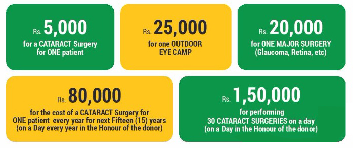 Additional Contributions can also be utilized in several ways: • Training deserving eye care professionals • Carrying out research in eye care or • Setting up new facilities/Infrastructures You can choose to make a one-time contribution or pledge long term support for a range of eye care services. As a donor, you can also specify a person or organization in whose name you wish to sponsor the chosen services. We will be happy to acknowledge your support by naming the program or facility as per your request. Please make your contributions by contacting us! All contributions to the trust are 80G exempted from Income Tax.