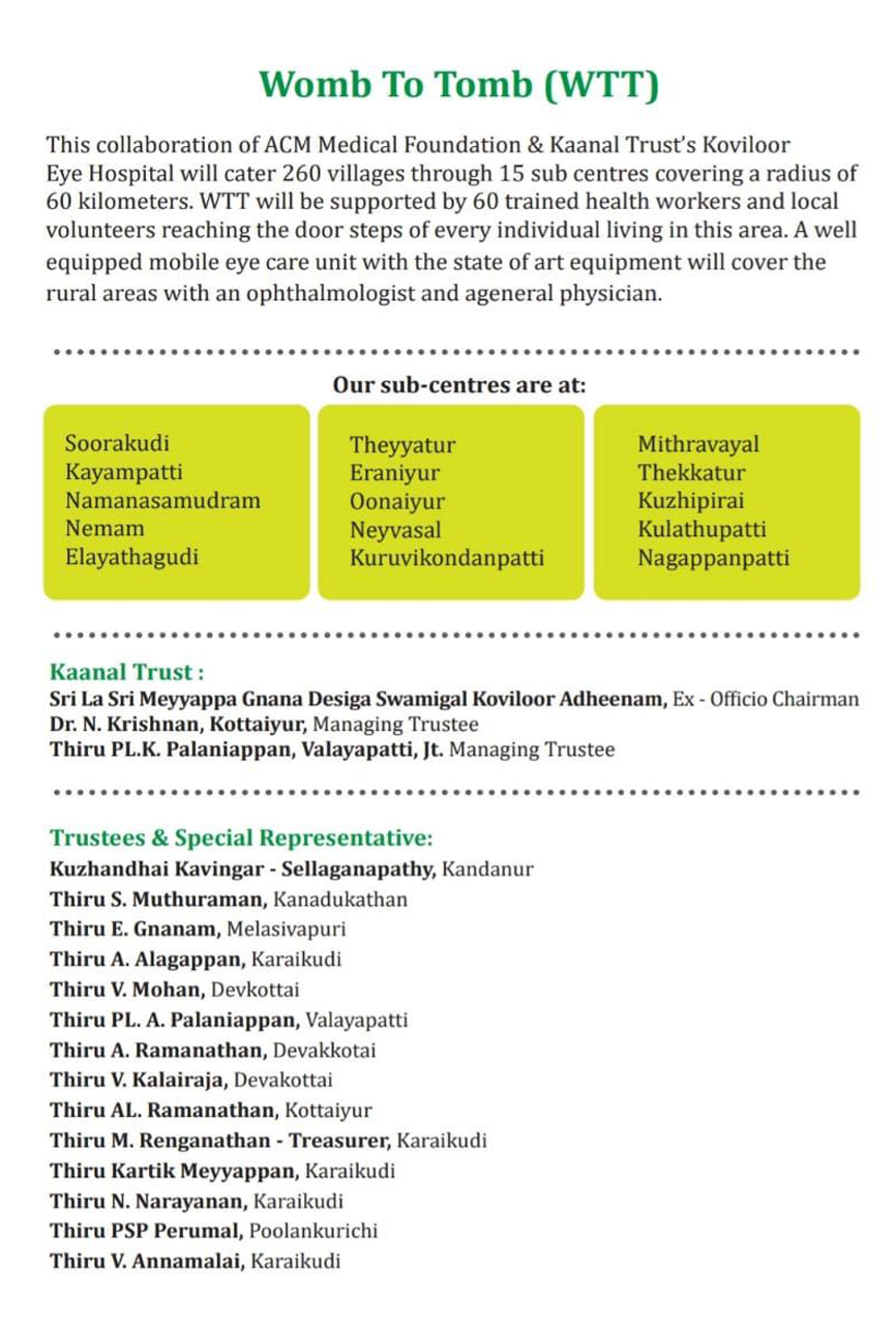 An unique “ Womb To Tomb ( WTT ) ” program in collaboration with ACM Medical Foundation, Chennai and KEH is providing Eye care to over 260 Villages covered by 15 Primary Health Care Centers ( PHC ) covering a radius of over 60 Kilometers. WTT is supported by over 60 trained health care workers reaching door steps of every individual living in these villages. A well-equipped eye mobile unit with state-of-the-art equipment along with Ophthalmologist and general physicians visit these 15 PHCs every month following pre-announced schedule. Since its inauguration KEH has treated over 5000 patients till date. No fees are charged for these services.